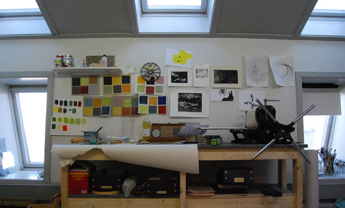 Billedet er fra mit yndlingsarbejdssted under tre ovenlysvinduer og plads til min formidable trykpresse (som er en hel historie i sig selv: Det var en foræring fra den fine illustrator Erik Hjorth Nielsen – og jeg holder helt utrolig meget af den, og planlægger at bruge den endnu mere i fremtiden)